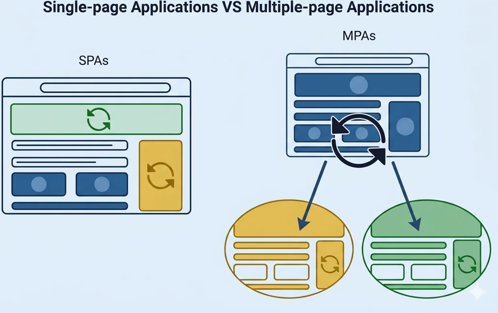 MPA (Multi-Page Application) to model klasyczny – każde kliknięcie pobiera nową stronę z serwera, tak jak przejście między kolejnymi salami restauracji. Sprawdza się tam, gdzie treści jest dużo, i ważne jest, by były łatwo znajdowane w wyszukiwarkach.
